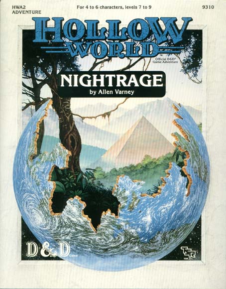 BRIGHT AND DARK Snakes fly, stones walk, and colossal monsters burrow in the world's crust - do these omens fore- tell catastrophe? Perhaps so, for now that dark elves walk in the sunlight, wearing armor that turns the sharp- est blades and strongest spells. They are poised to conquer the fabulous Hollow World. But what is this armor? How does its creation involve the ancient, mile-long Great Annelids, as well as those wondrous creatures, the feathered serpents? The mystery's solution draws your heroes across three thousand miles, from ruins to seaports, through the trackless ca- verns beneath the World's Spine, and finally to the eternal land of Nithia. There, your heroes discover the true meaning of... NIGHTRAGE! Nightrage is the second part of the far-ranging Blood Brethren trilogy. You can play these three HOLLOW WORLD modules in any or- der, or play this 64-page adventure by itself! You need the D&D HOLLOW WORLD Campaign Set to play. EASILY ADAPTABLE TO THE AD&D GAME! |
