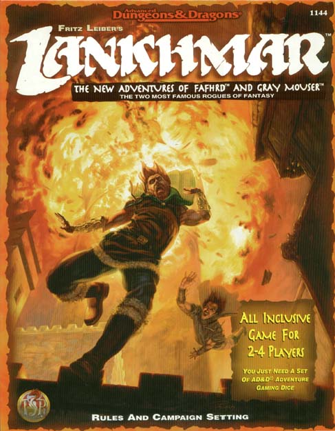 GRAY MOUSER, the greatest adventurers in the world of Newhon. Fritz Leiber's classic characters and world spring to life in this stand-alone role-playing game. Featuring a streamlined set of rules that were designed expressly for LANKHMAR adventures, yet are fully compatible with the ADVANCED DUNGEONS & DRAGONS game, this boxed set lets two or more players invent their own tales of high adventure in the winding, shadowy streets of Lankhmar. It includes three books: an easy-to-read rulebook, a guide to creating exciting adventures in the world of Newhon, and a pre-made adventure, plus a two-sided, full-color poster map of the City of LANKHMAR and the world of NEWHON. Even if you haven't yet read the Lankhmar stories and novels of Fritz Leiber, this set will provide countless hours of roguish enjoyment. To play this game, you need at least one set of polyhedral dice (4-, 6-, 8-, 10-, 12-, and 20-sided dice). They are available where you found this game, and at hobby shops everywhere. |