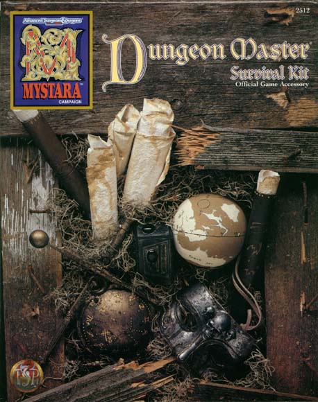 Whether you're an experienced Dungeon Master or a novice taking his first steps on the road to adventure, the DUNGEON MASTER Survival Kit will make your campaign more exciting and dramatic than ever! Within this unusual product you'll find... Two dozen loose sheets covered with a wide array of forms, charts, and handouts designed to make the DM's job easier and his games more exciting. A special deck of cards that introduces over 20 new magical items to the MYSTARA campaign. Plus, DM's will find a copy of the Deck of Spheres, a new artifact that may well be the most powerful magical item in the Known World. A 16-page booklet of DM's information that includes information about the languages of Mystara and tips on making better, more exciting maps. A full-color, 16-page Campaign Log that allows the DM to keep track of the highlights of his campaign. |