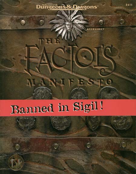 Item Code: #2611 Title: The Factol's Manifesto Type: Accessory Author: Tim Beach, Dori Jean Hein, and J.M. Salsbury Published: 1995 Format: 160-page perfect-bound book, fold-out map, "Banned in Sigil" wraparound |