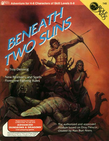 Item Code: #742 Title: Beneath Two Suns Type: Adventure For: 4-6 characters, levels 6-8 Author: Troy Denning Published: 1986 Format: 32-page book |