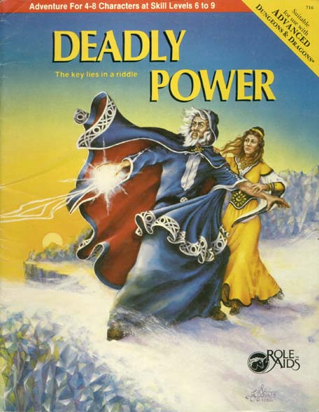 Item Code: #716 Title: Deadly Power Type: Adventure For: 4-8 characters, levels 6-9 Author: Laurel Nicholson, John Keefe, and Donald Nicholson Published: 1984 Format: 40-page book |