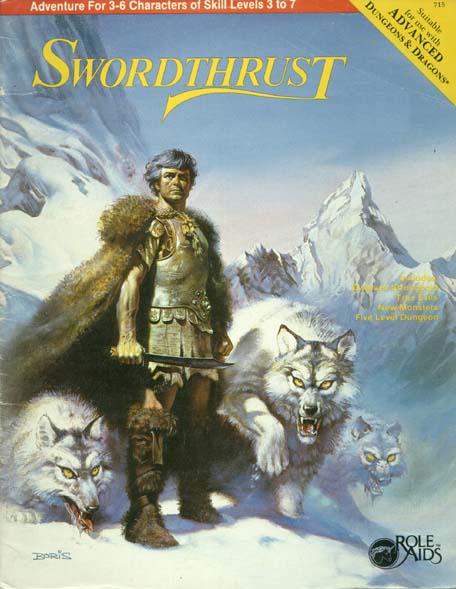 Item Code: #715 Title: Swordthrust Type: Adventure For: 3-6 characters, levels 3-7 Author: Sam Shirley and Daniel Greenberg Published: 1984 Format: 40-page book |