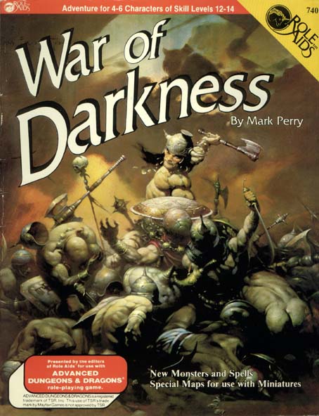 Item Code: #740 Title: War of Darkness Type: Adventure For: 4-6 characters, levels 12-14 Author: Mark Perry Published: 1986 Format: 32-page book w/double-cover |