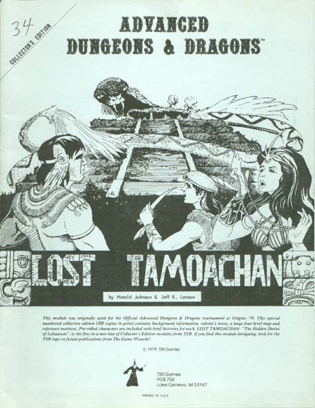 | This module was originally used for the Official Advanced Dungeons & Dragons tournament at Origins '79. This special numbered collectors edition (300 copies in print) contains background information, referee's notes, a large four-level map and reference matrices. Pre-rolled characters are included with brief histories for each. LOST TAMOACHAN: "The Hidden Shrine of Lubaatum", is the first of a new line of Collector's Edition modules from TSR. If you find this module intriguing, look for the TSR logo on future publications from The Game Wizards! |