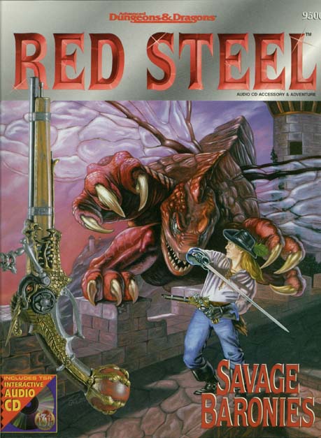 Stout mercenaries. Rugged gauchos. Arrogant nobles. Vile monsters. The Savage Baronies are home to all these and more! This accessory for the RED STEEL campaign holds a 64-page sourcebook that covers each of the nine Savage Baronies in detail, including the rulers of the lands, the attitudes of their people, and the effects of the Red Curse on those people. Also included is a 32-page adventure, set in the Savage Baronies and the surrounding lands. The goblinoids of the Yazak Steppes are building another horde! Invasion is imminent, and it's up to the player characters to stop it! Included with the adventure are handouts and pregenerated characters that can be used as PCs or NPCs. Savage Baronies also contains an audio CD with background music and sound effects to enhance the setting's mood of danger and adventure. The CD is not an audio adventure, but a gaming aid usable in any AD&D game adventure! In addition, a full-color poster map shows an overview of the Savage Coast. |