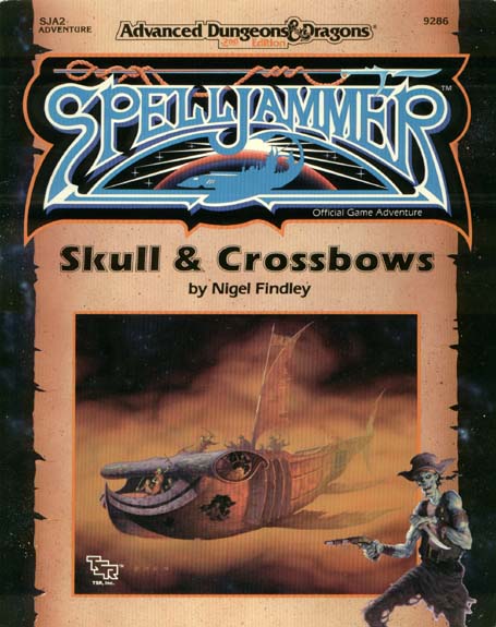 called pirates. It's these pirates that you've been hired to hunt. With letters of marque in your mapcase, your job is to track down and capture, alive or dead, some of the most dangerous characters in the known (and unknown) spheres. Of course, not everyone in space is a pirate. You'll also meet Torgan Betz (a man famous for bending the laws, rarely breaking them), Tiktitik, the Thri-kreen crusader, "Thought Taker," the illithid, and the feared Drow commander Teela Darkcloud. Even so, they all have their personal agendas, and it's often hard to tell enemies from friends. Skull & Crossbows is an anthology of adventures for the SPELLJAMMER campaign setting. This 64-page anthology easily follows Wildspace, but can be used in any existing AD&D SPELLJAMMER campaign. This adventure is designed for a party of four to six characters, levels 6 to 10. |